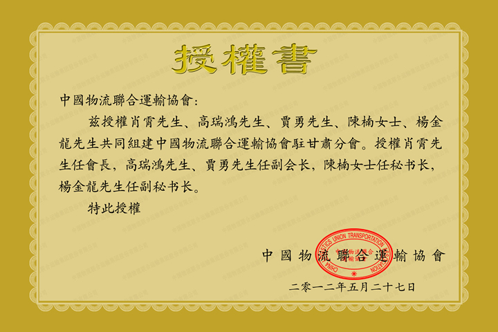 中国物流联合运输协会甘肃分会授权书